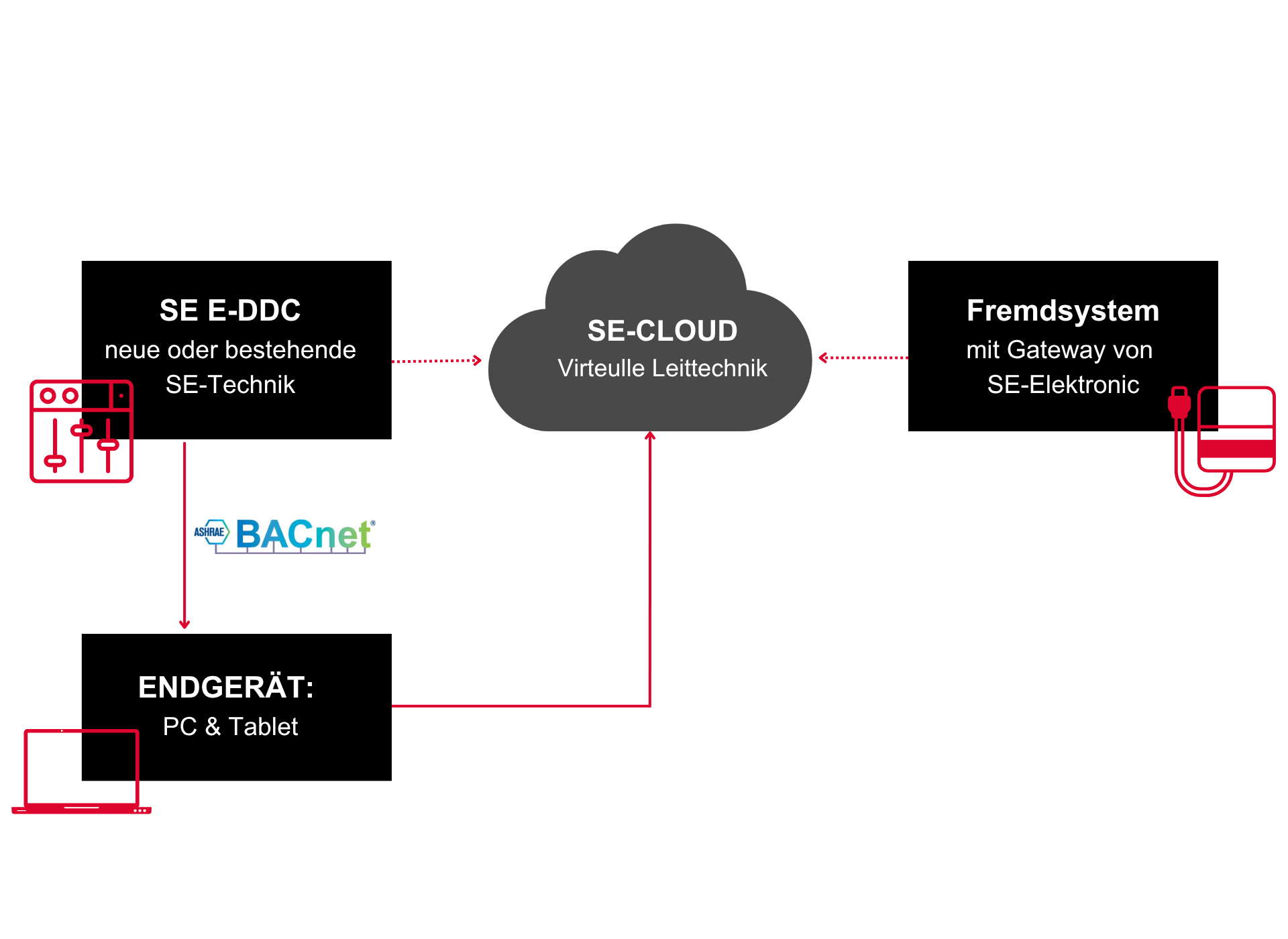 Die SE-Cloud – ehemals unter dem Namen Virtuelle Leittechnik (VLTech) bekannt – ist ein Datenerfassungs- und Datenmanagementsystem, das auf den Kommunikationsstandards BACnet und TCP/IP basiert. Entwickelt von SE-Elektronic, führt sie die Steuerung und Überwachung von Gebäude- und Anlagenzuständen in eine neue, digitale Dimension.