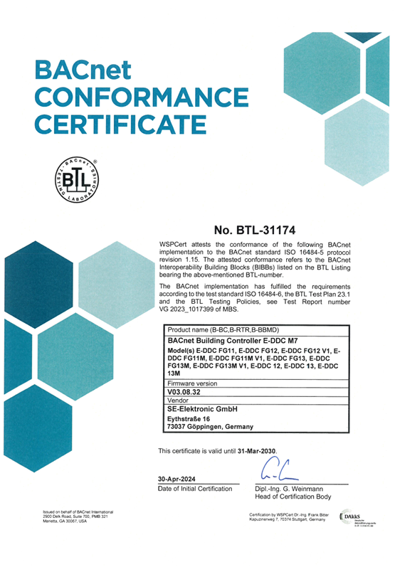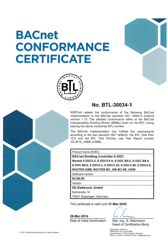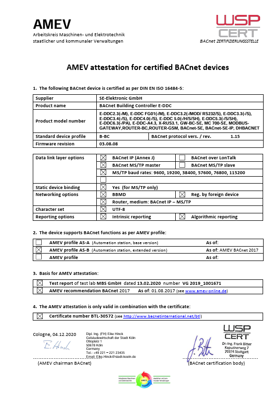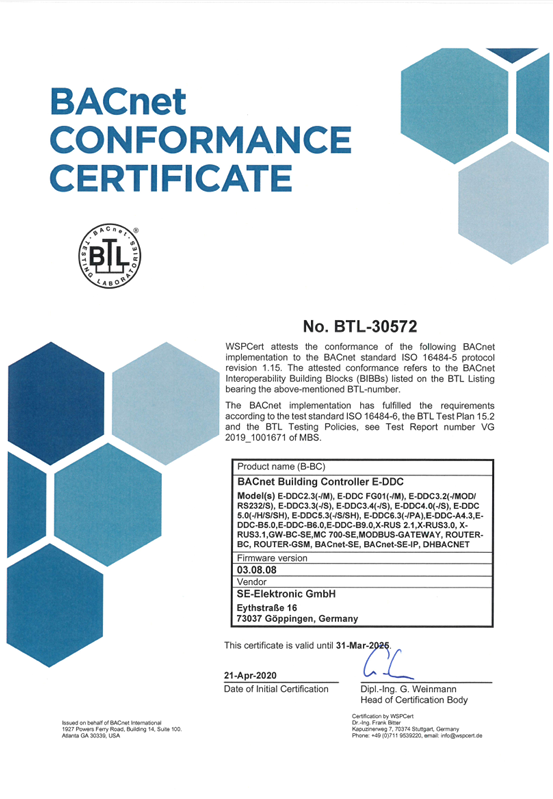Hier finden Sie die aktuellen BACnet-Zertifikate unserer Geräte nach dem BACnet-Standard ISO 16484-5:2017, BACnetBuildingController E-DDC Rev. 12: BACnet-Zertifikat Rev. 15: BACnet-Zertifikat BACnetBuildingController E-DDC M7 Rev. 15: BACnet-Zertifikat BACnetAdvancedApplication Controller M-DDC Rev. 15: BACnet-Zertifikat