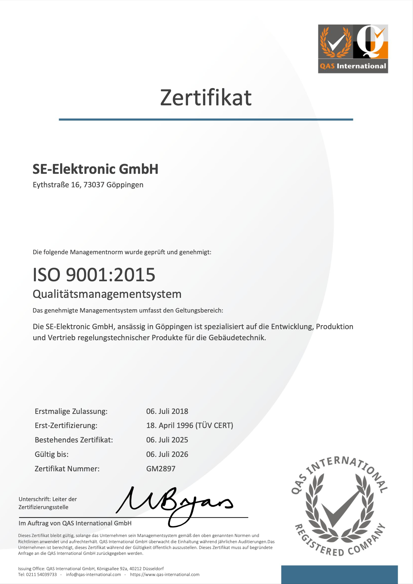 Nicht nur die Produkte von SE-Elektronic sind zertifiziert, sondern auch unsere Arbeitsabläufe. Wir haben ein zertifiziertes Qualitätsmanagement nach ISO 9001:2015 seit 1996.