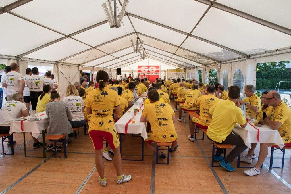 30.06.2018 on time at 08:00 approx. 180 cyclists with their yellow jerseys came to us for breakfast. For the second time the Tour Ginkgo was our guest. Already in 2012 we had given them a warm welcome. This year, the donations will go to Lebenshilfe Göppingen.