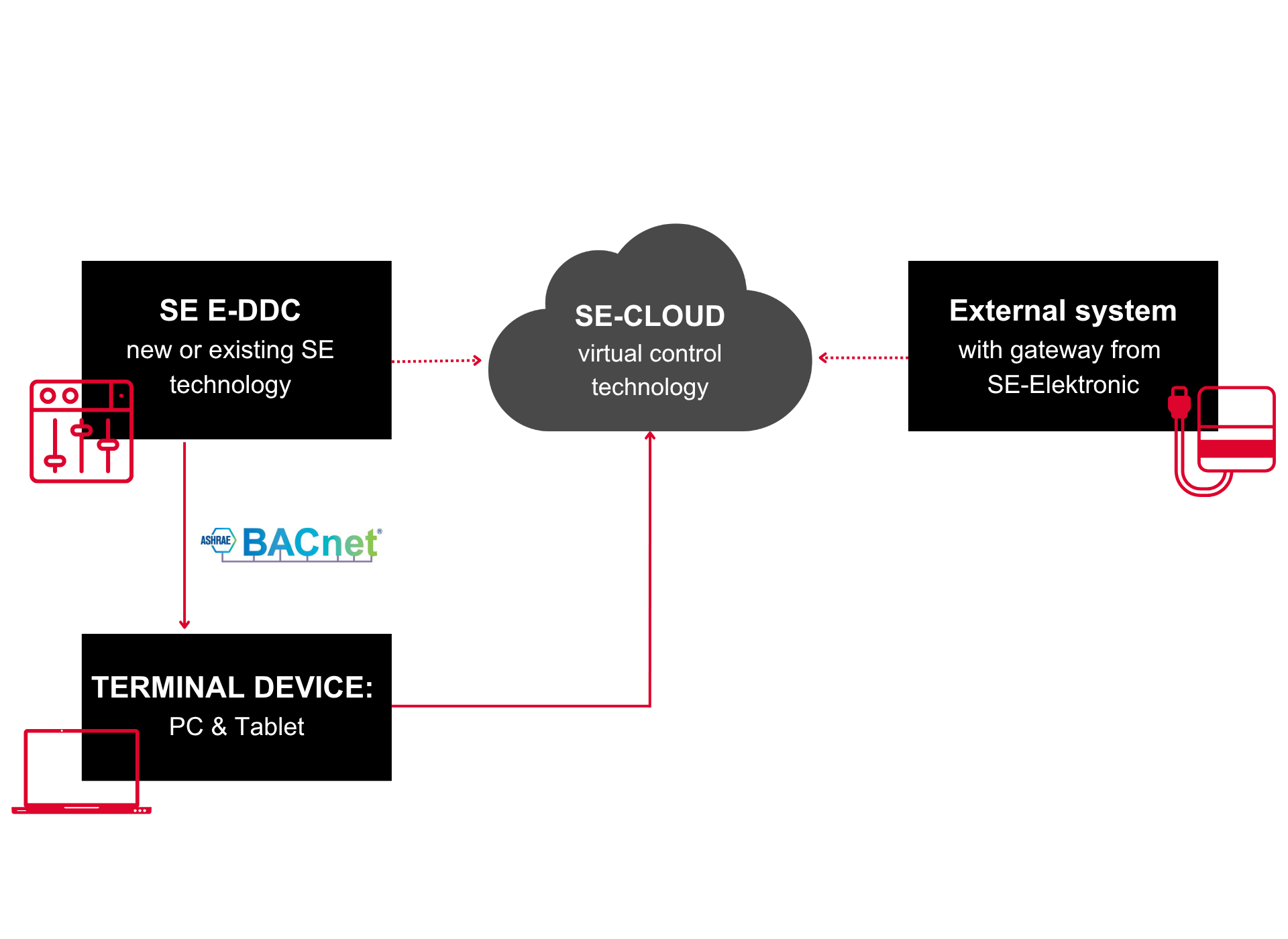 The SE Cloud—formerly known as Virtual Control Technology (VLTech)—is a data acquisition and data management system based on the BACnet and TCP/IP communication standards. Developed by SE-Elektronic, it takes the control and monitoring of building and plant conditions into a new, digital dimension.