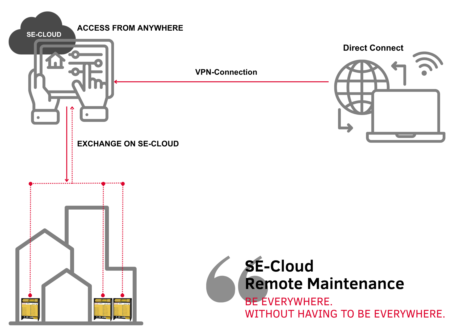 Technician access allows project configurations to be adjusted, SE devices to be accessed in the local network, and updates to be installed centrally.