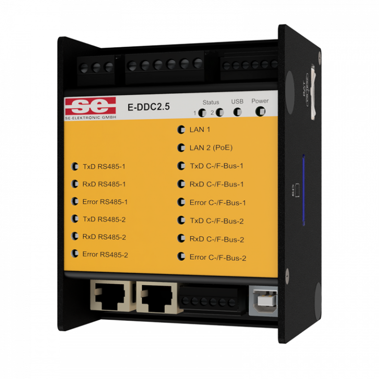 - 2× RS485 Schnittstellen (2-Draht) zur Kommunikation über BACnet MS/TP (mit Router-Funktion), Modbus RTU (Client/Server) und SE-Standard A-, B-, E-Bus
