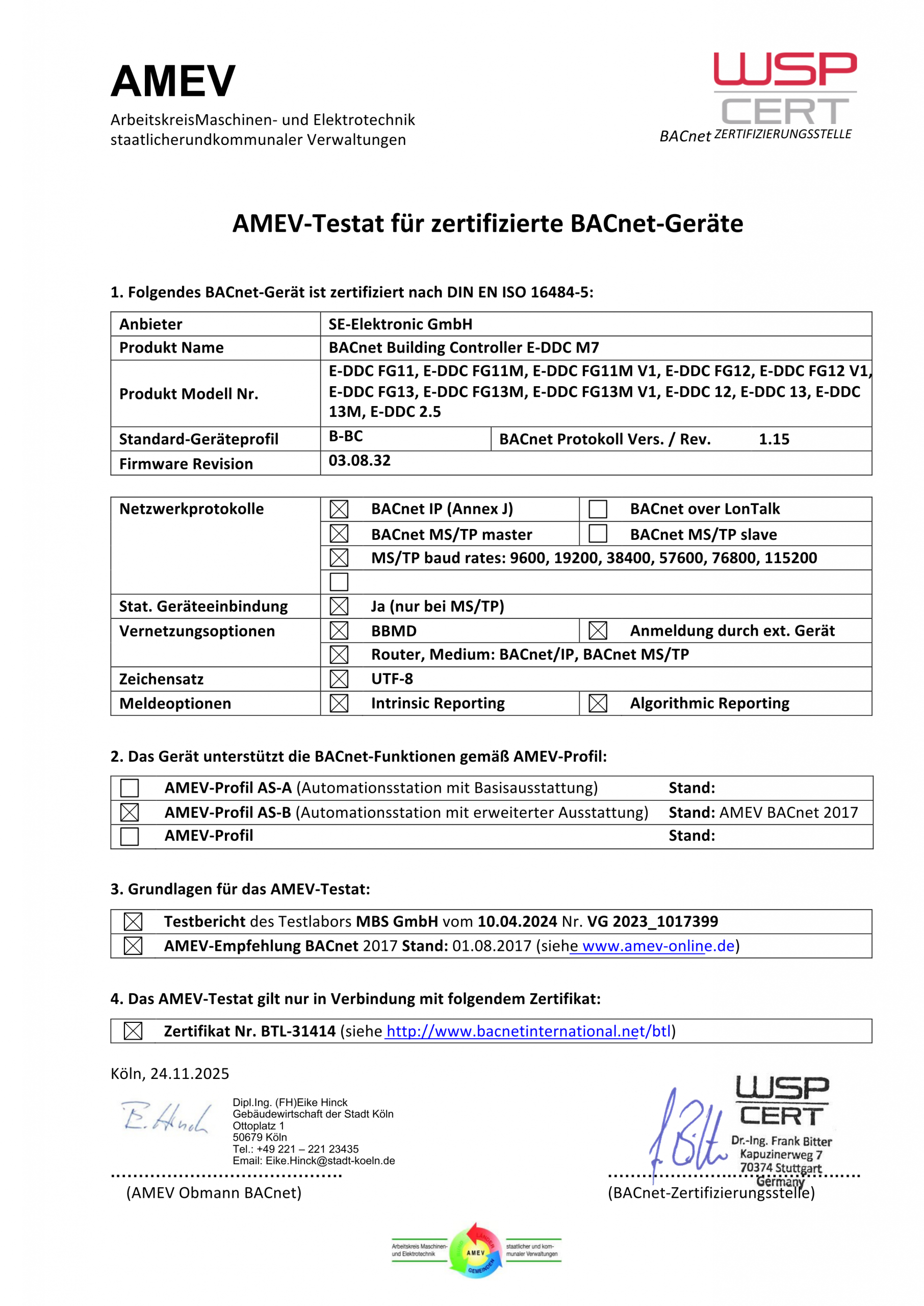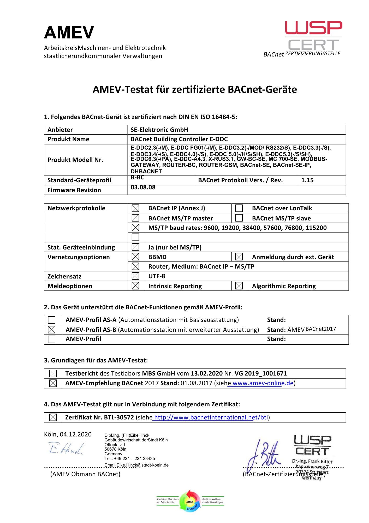 AMEV-Profil AS-B: AMEV-Attestat für zertifizierte BACnet-Geräte